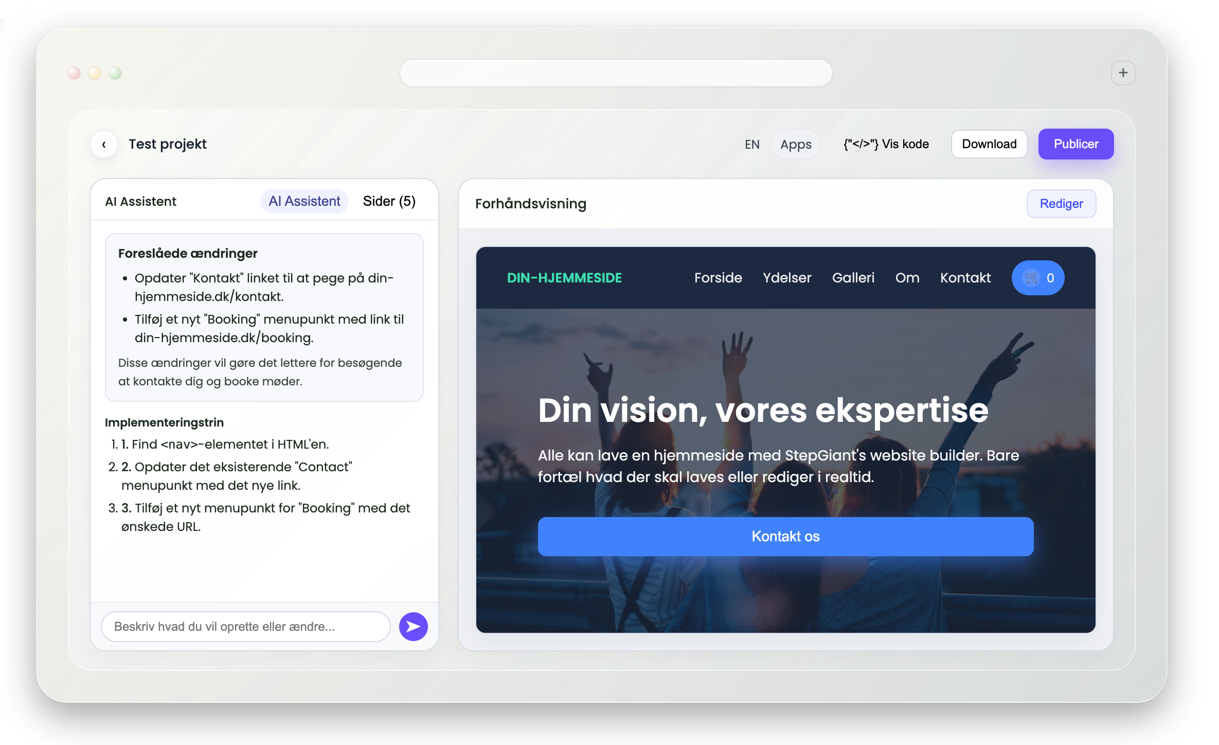 −StepGiant er en AI-drevet website builder, hvor du kan bygge hjemmeside, webshop, booking og mailsystem – alt samlet i én platform. Du skriver til AI’en, og den bygger og redigerer din side automatisk.